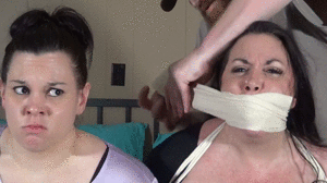 Gina and Courtney are bound and seated on the bed. They are being gagged by an intruder. The mother step-daughter pair are arguing over who is at fault for the predicament. Each blames the other for not locking the door. Both ladies are panty gagged with a huge pair of full back panties held in with sticky medical tape wrapped around their heads. The are hogtied on the bed and they struggle still arguing through their pantygags. Courtney is wearing jeans with pantyhose and strappy heels. Gina is wearing a dress, pantyhose and matching strappy heels.