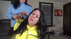 Busy trying to pack her things for a move, Gina is interrupted by her doorbell. It's one of those awful door to door sales ladies. Gina tries to explain nicely that she doesn't have time but this pushy girl just isn't taking no for an answer. She tells Gina that she never leaves without making a sale, as she pushes her way into the house. Gina tries and tries to tell her that she's wasting her time, but Crystal continues to rant about he pantyhose she is selling. Suddenly Gina has had enough and she knows exactly how to stop this insanity. Gina uses a pair of pantyhose to choke Crystal while she handgags her and drags her off. Gina encases the rude stocking sales lady in her own pantyhose, using duct tape to be sure that she isn't going to wriggle out any time soon. She uses he own panties to gag Crystal's big blabbering mouth, She pushes them in and pulls them out, she makes crystal smell them before gagging her AGAIN AND AGAIN!!Gina roughly crams her full back panties into Crystal's mouth one last time. They are clearly too big, but Gina doesn't care. She forces them in and grabs a roll of sticky duct tape winding it tight around Crystal's pretty blonde locks. Gina grabs the stockings that are used to encase Crystal's upper body and tears them open until her boobies spill out. Gina makes fun of her as she squeezes them hard and then leaves Crystal to finish her packing. She reminds Crystal that her house is being foreclosed on and it may be weeks or even months before anyone finds her if she can't get free. Crystal furious looks for something to help her out of her dilemma but she isn't going to find it in this back bedroom. She scoots her way out of the room and out of the hall. Once she makes her way down to the end of the hall, she is greeted by Gina who has finished up and is leaving. Gina hand gags her and then pulls a stocking tightly over her face before leaving. Crystal continues on her journey through the entryway, the laundry room and finally to the garage only to find that everything is gone and there is nothing left to aid her in her escape. That's what happens when you are pushy and annoying!!!