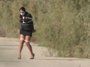 When her captor is making the ransom call, Gina makes a run for it down the deserted road. Her upper body is bound and she is hobbled at the knees. Wearing a business suit and sexy pantyhose with high heels, she darts in and out of the bushes. She knows she only has a short time to reach help before he realizes she is gone. Can she get help, or will he grab her and drag her back to the old shack?