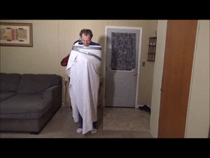 Gina's talking on the phone with a friend and the friend is telling her about how the lady down the street had her home broken into and the burglar wrapped her from head to toe in sticky duct tape. She gets off the phone and repeats the conversation to Matt. She tells Matt how Suzie was taped from head to toe rolling around her house trying to find something to cut herself free for 2 days. Matt calls suzie a baby and says that it must not be true because there is no way to be duct taped, cocooned and mummified not be able to get out of it. Gina totally disagrees and the two make a bet. Matt bets Gina that there is no way she can tape him up and make him totally helpless. The two shake hands and Gina begins with a layer of saran wrap, followed by a blanket fixed with duct tape. She then covers that with a thick napping bag and then uses another solid layer of duct tape over that. Gina takes off her panties and gags Matt with them, sealing them in with more sticky tape. She laughs at Matt and gives him 15 minutes to get free. Matt tried hard to get out of the tape. Do you think Matt can get free? You will have to buy the clip to find out.