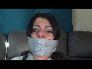 Gina drops by Samantha's house to drop off a pair of shoes that she left a Gina's last week. Sam asks her for some help with a webcam show, but Gina explains that she is in a hurry because she has already made plans. Sam tells her it will just be 5 minutes of her time and she offers to pay Gina. Gina agrees as long as it's just a fast appearance. Gina is now wearing on a sweater and nylon tights. Soon she has Gina almost totally taped up and Gina is starting to worry because Sam never mentioned using so much tape.Sam explains that she never does that wimpy fake bondage stuff for her viewers. They expect the real deal. She tells Gina that it's time to sock gag her, as she folds a big thick sock and presents it. Gina agrees but says that after the gag, she really has to leave. Samantha agrees and packs the sock in Gina's mouth wrapping it in with many layers of sticky duct tape around her head. Once securely gagged, she flips Gina over on her duct taped elbows and knees and smacks her exposed pantyhose covered butt. She settles down with some popcorn and despite Gina's gagged protests, she uses her friend as a footstool. Gina gag talks frustrated and grows into the thick sock in her mouth. Samantha laughs and taunts Gina while thousands of fans watch. She even offers the bowl of popcorn to Gina holding it close to her gagged face knowing that Gina will be even more angry that she can't have any.