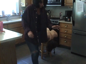 Still seated on the granite counter top bound in phone wire and tape gagged, the photographer returns and pushes her on her stomach, tightly hogtying her and leaving her to struggle.