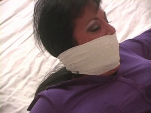 Bound and gagged on the bed, Gina tries desperately to call for assistance. She is able to dial with her nose, but will she be able to get the person on the other end to understand what she is trying to say?