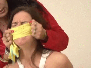 Gina is tired of her room mate Candle's big fat ego. Candle is always bragging about her expensive clothes and fancy dates. Gina and candle are hanging out and candle, full of herself, is on the phone with her latest catch. Her blind date for the night is some guy she met in a chat room and candle is talking to him making plans to meet him. Gina is jealous and when candle hangs up the phone and starts talking about how gorgeous she looks in her expensive clothes and how Gina can never afford anything nice and even if she could, she would never look as good as Candle. She asks Gina to adjust her collar and Gina reaches her breaking point. She grabs candle by the pony tails and hand gags her. Next we see candle stripped to her pink panties while Gina is ranting. Gina goes over to her and removes her own WELL WORN PANTIES and rubs them in candle's face. She packs them into candle's mouth and wraps a bunch of tape around her pretty head. She then proceeds to tell Candle she will be taking her place tonite on the blind date and puts on Candle's expensive clothes. She moves over to Candle who is bitching through her gag and uses scissors to cut off candle's panties. She removes the wad of soaked panties from candles mouth and rubs candle's panties in her face before packing them deep in her mouth. Gina adds her own panties once again to candle's already packed mouth and this time uses clear tape to hold them in. Candle is furious and Gina even steals her $500 shoes before skipping out the door to meet Candle's man. Candle is left rolling around on the floor bitching through 2 pairs of used panties.