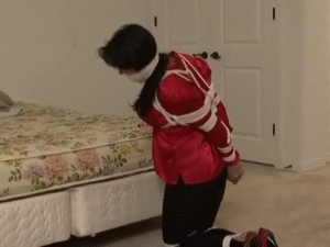 Gina Rae is bound and gagged on the bed. She makes her way off the bed and down the hall. She scoots and rolls across the living room into the kitchen area. Lot's of frustration, grunting, and constant gag bitching that only Gina Rae can deliver.